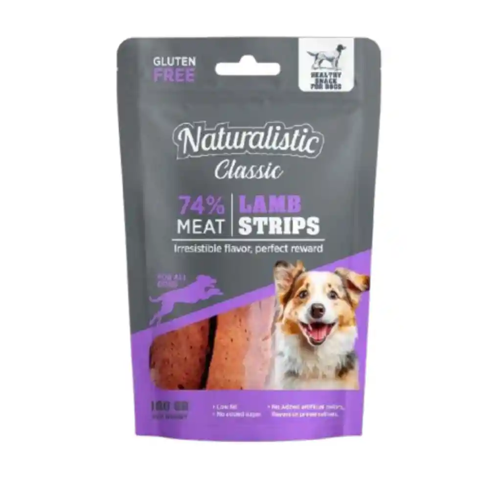 Naturalistic® Lamb Strips son Snacks formulados con carne de cordero (74%) e indicados para perros con alergias o sensibilidades digestivas. Bajos en grasa y con un alto contenido de Omega 3 y 6. Libres de gluten (maíz), azúcar adicionada, colorantes y conservantes artificiales. Las ventajas de este producto son: Omega 3 y 6: Para una piel sana y pelaje brillante. Producto natural: No contiene conservantes artificiales, ni colorantes. Necesidades especiales: Ideal para perros con alergias alimentarias o sensibilidades digestivas.