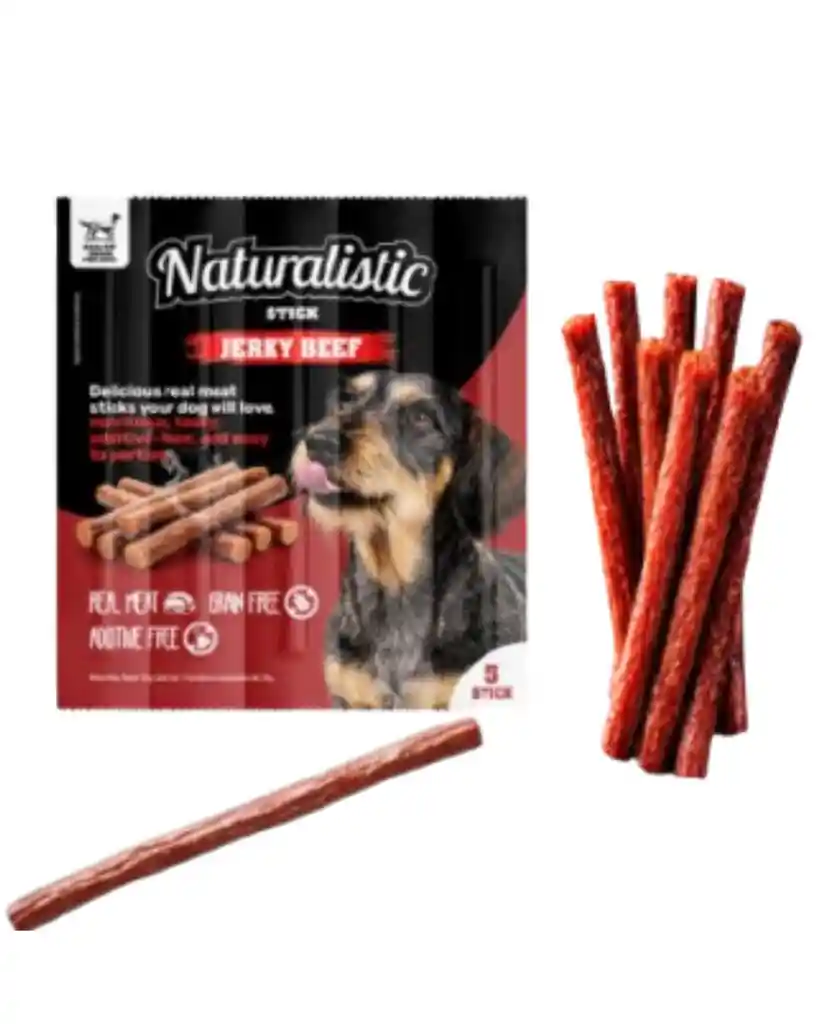 Naturalistic Jerky Beef Stick. Son palitos de carne real horneados, diseñados como premio o merienda nutritiva para mascotas. Elaborados sin granos, sin aditivos químicos, conservantes artificiales, ni colorantes. Formulados libre de gluten y azúcar. Alto contenido proteico, bajo en grasas y rico en Omegas 3 y 6 para la salud de la piel y pelaje. Su textura y formato práctico permiten porcionar fácilmente, convirtiéndolos en una recompensa nutritiva, equilibrada y llena de sabor para disfrutar todos los días. Ingredientes: Vacuno y subproductos del vacuno, almidón vegetal, glicerina, sorbitol, sorbato de potasio, sal, extracto de romero.