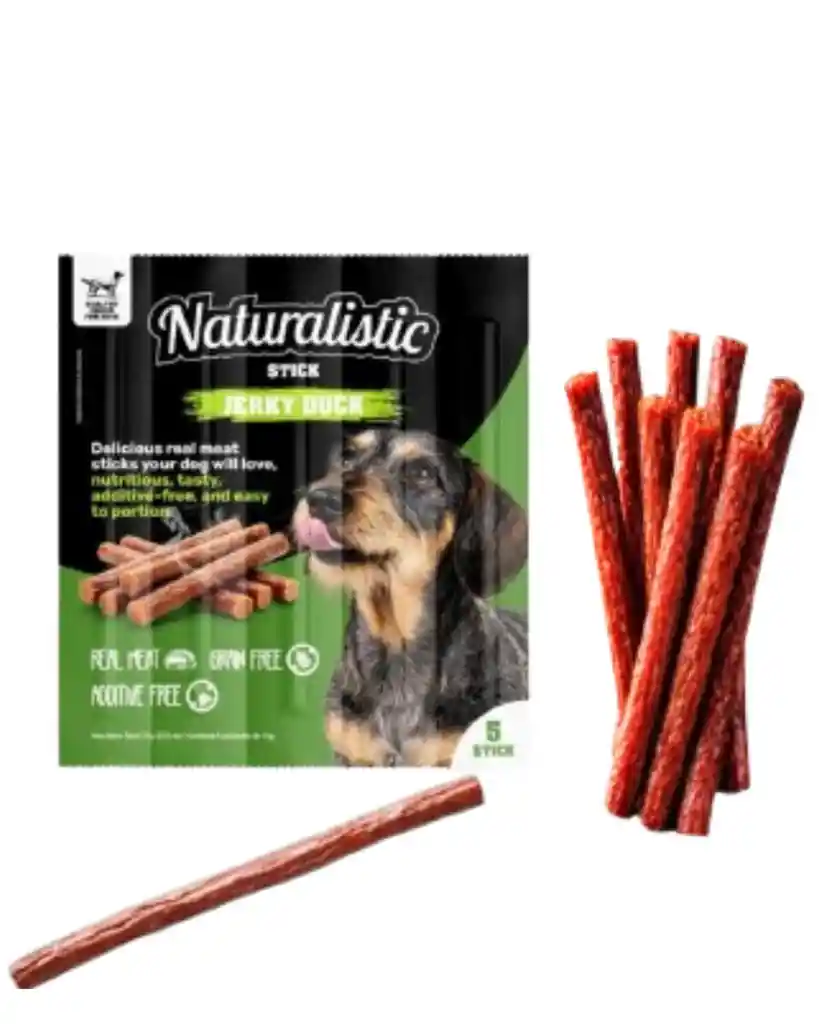 Naturalistic Jerky Duck Stick. Son palitos de pato real horneados, diseñados como premio o merienda nutritiva para mascotas. Elaborados sin granos, sin aditivos químicos, conservantes artificiales, ni colorantes. Formulados libre de gluten y azúcar. Alto contenido proteico, bajo en grasas y rico en Omegas 3 y 6 para la salud de la piel y pelaje. Su textura y formato práctico permiten porcionar fácilmente, convirtiéndolos en una recompensa nutritiva, equilibrada y llena de sabor para disfrutar todos los días. Ingredientes: Pato y subproductos del pato, almidón vegetal, glicerina, sorbitol, sorbato de potasio, sal, extracto de romero.