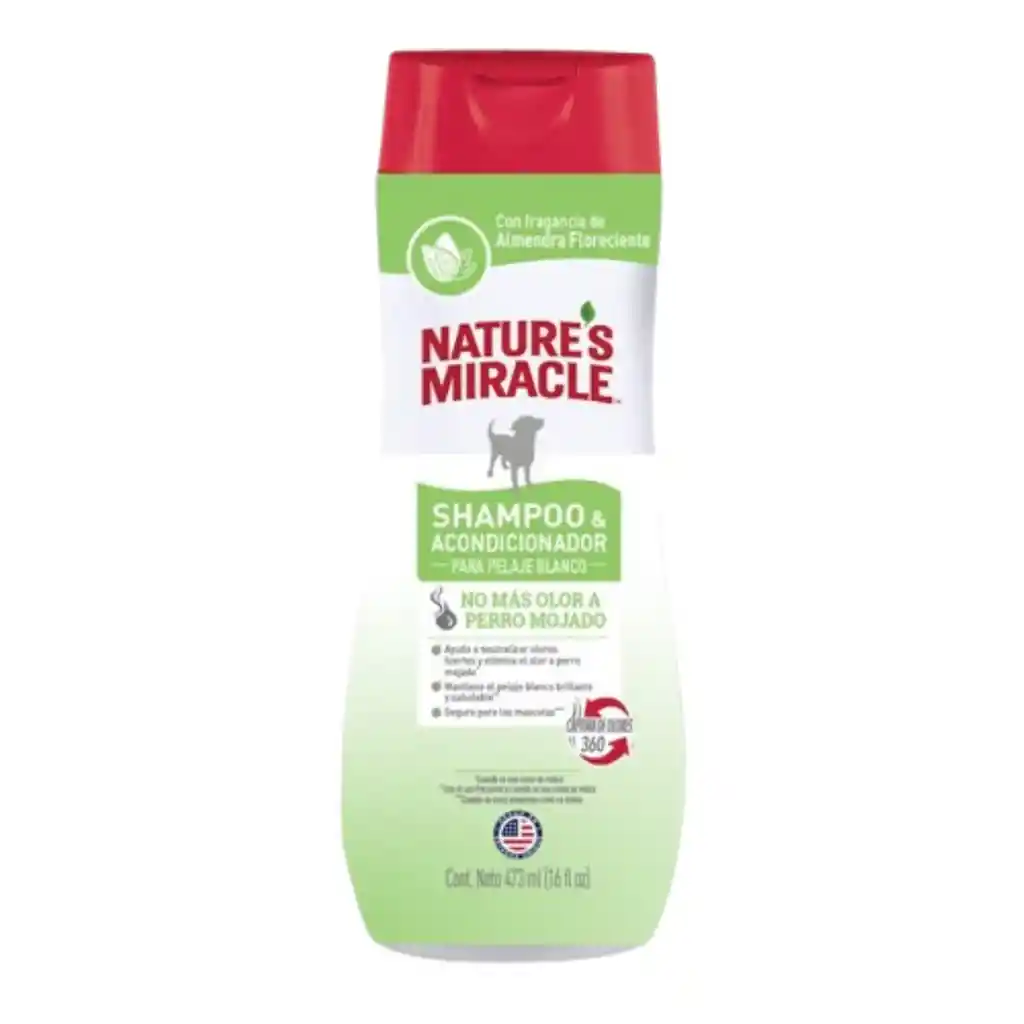 Despídete del olor a perro mojado ¡Llegó el shampoo y acondicionador 2 en 1 de Nature’s Miracle ™! Este shampoo y acondicionador 2 en 1 ayuda a neutralizar los olores y refresca con Fragancia a Almendras Floricienta, eliminando el olor a perro mojado. Esta fórmula mantiene el pelaje blanco brillante y saludable con el uso frecuente y cuando se usa según las indicaciones. Este shampoo y acondicionador contiene extracto de caléndula, aloe vera, pantenol, queratina y agua de coco. Instrucciones: 1. Aplique una cantidad abundante de shampoo sobre la capa húmeda y forme espuma. 2. Masajee suavemente de la cabeza a la cola, evitando los ojos. 3. Enjuague completamente y repita según sea necesario para los olores más difíciles. 4. Cepille el pelaje de su perro para eliminar los enredos y seque bien con una toalla. Las áreas enmarañadas y enredadas pueden requerir atención especial. Se puede aplicar shampoo adicional directamente en estas áreas. Ingredientes: Agua, sulfonato de olefina de sodio C14-16, cetilo/lauril/miristilo. Hidroxisultaína, cloruro de sodio, sulfato de sodio, olefina C14-16, disodio. Cocoanfodiacetato, propilenglicol, fenoxietanol, compuestos de amonio cuaternario, Hoja de aloe barbadensis, benzoato de sodio, sorbato de potasio, sulfito de sodio, fragancia Almendra floreciente, policuaternio-7, hidróxido de sodio, etilhexilglicerina, pantenol, Queratina hidrolizada, extracto de caléndula officinalis, disodio distiril bifenil disulfonato, Cocos nucifera fruta en polvo, acetato de tocoferilo.