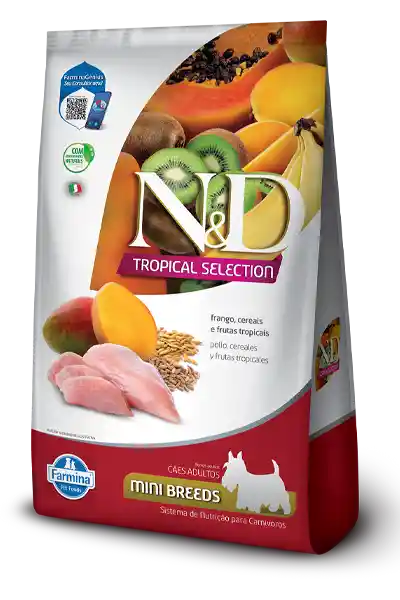 El alimento ND Tropical Selection Mini Adulto Frango 2.5 kg es una opción premium formulada para perros adultos de razas pequeñas. Esta fórmula combina ingredientes naturales y de alta calidad para satisfacer las necesidades nutricionales específicas de tu mascota. 🐶 Características principales Proteína de alta calidad: Contiene carne de pollo deshuesada (20%) y proteínas de pollo deshidratadas (20%), proporcionando una fuente rica y digestible de proteínas esenciales. Farmina Cereales ancestrales y frutas tropicales: Incluye espelta (12%), avena (12%) y frutas como plátano, kiwi, mango, papaya y piña deshidratadas (cada una al 0,5%), aportando fibra, vitaminas y antioxidantes naturales. Farmina Sin transgénicos ni colorantes artificiales: La fórmula está libre de ingredientes modificados genéticamente y colorantes artificiales, promoviendo una alimentación más natural. Enriquecido con nutrientes esenciales: Contiene glucosamina y sulfato de condroitina para la salud articular, así como prebióticos (FOS y MOS) para favorecer una digestión saludable. Tamaño de croqueta adaptado: Diseñado específicamente para las mandíbulas pequeñas de razas mini y pequeñas, facilitando la masticación y la ingesta.