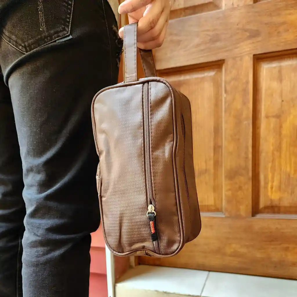 Neceser perfecto para guardar productos de higiene personal cuando viajas, ofrece una organización eficaz, portabilidad perfecta y es ideal para desplazamientos. Con una disponibilidad de dos compartimientos, contando con uno principal y uno en la parte delantera para mayor organización. Características: Material: Textil Color: Marrón. Dimensiones: 10.7 cm de largo, 3.8 cm de ancho, 6 cm de alto. Peso: 0,3 kg Estructura: Este diseño cuenta con dos compartimientos, uno central y uno en la parte delantera, de un tamaño más reducido. Estilo: Es un diseño sencillo y elegante el cual puedes llevar a cualquier lugar para combinar. Detalles del producto; Cierre y cremallera metálicos: Para una durabilidad mayor y un cierre seguro. Correa: Contiene un mango para una mayor movilidad. Dos compartimientos: Para una mayor organización, este neceser cuenta con un cierre central de mayor tamaño y un cierre más pequeño en la parte delantera del producto. Ventajas: Durabilidad excepcional: Garantizada por la calidad de los materiales y la confección. Diseño: Cuenta con un diseño elegante y sencillo por lo cual es fácil de combinar para cualquier tipo de ocasión. Usos recomendados: Viajes: Es perfecto para mantener organizados los espacios en nuestras maletas o bolsos dentro de un viaje. Neceser de higiene personal: Puedes mantener tus utensilios de higiene personal organizados en un solo espacio para una mayor rapidez al encontrarlos, como también para mantener un espacio más ordenado. Para el día a día: al contar con un mango, este neceser puede funcionar para una salida rápida a cualquier lugar al que no se necesite llevar muchas cosas.
