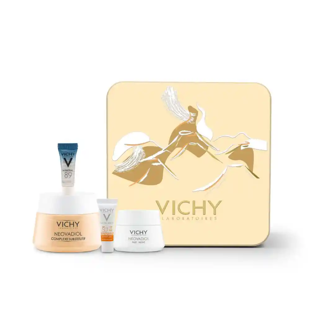 Tratamiento para pieles maduras, que ayuda a combatir los efectos de la menopausia en la piel. Entregando mayor firmeza, densidad y volumen en el rostro durante en día. El cofre incluye: 1. Fortifica: Mineral 89 (4 ml). Uso diario fortifica, rellena e hidrata la piel. 2. Trata: Neovadiol complejo sustitutivo día (50 ml). Es realmente eficaz, dando como resultado una piel visiblemente rejuvenecida en todas sus dimensiones. Emulsión suave y nutritiva, con aceite de salvado de arroz, aceite de albaricoque, cera de abeja y manteca de karité. Textura no grasa y no pegajosa. 3. Protege: Capital Soleil Anti-Edad (3 ml). Ligero con fórmula única que protege la piel contra los rayos UV gracias a sus filtros de amplio espectro spf. Enriquecido con antioxidantes, ayuda a corregir los signos de fotoenvejecimiento como arrugas, líneas finas, pérdida de elasticidad y opacidad. 4. Trata: Neovadiol complejo sustitutivo noche (15 ml). Impregna tu piel de juventud para una piel redensificada, volúmenes remodelados, luminosidad restaurada y un efecto frío al aplicar el tratamiento.