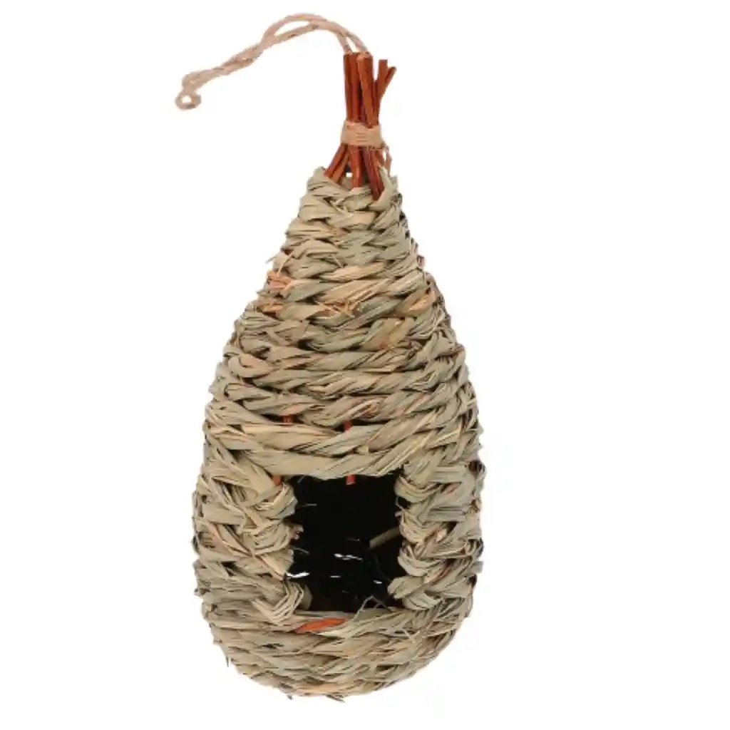Nido tejido a mano, diseñado como un refugio natural para aves pequeñas y medianas. Esta estructura elaborada de fibra natural biodegradable, proporciona ventilación y un ambiente acogedor tanto para interiores como exteriores. Características y Detalles Materiales: fabricadas con paja natural y totora. Estos materiales son ecológicos, duraderos y ofrecen un drenaje natural. Diseño: Presentan una superficie rugosa que facilita que las aves se sujeten y se sientan seguras. Incluyen una cuerda resistente para colgarlas de ramas, cercas o enredaderas. Uso: Sirven como refugio contra depredadores y climas adversos como viento o calor extremo. Son ideales para colibríes, canarios, periquitos y otras aves pequeñas Dimensiones: Alto 29 cm Ancho 14 cm