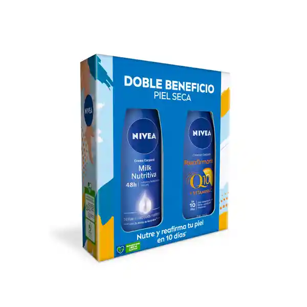 Contiene 2 Unidades de 400 mL c/u. Crema Corporal Milk Nutritiva 400 mL + Crema Corporal Q10 Reafirmante Piel Seca 400 mL. Con Nuestro Pack Doble Beneficio Hidrata y Reafirma tu Piel.