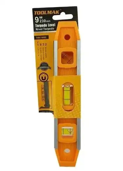 Uso: Medición. Medidas: 225mm (9 Pulgadas). Largo: (25) centimetros. Alto: 4 cm Imantado. 3 Burbujas (Plano horizontal, vertical y angular). Burbujas resistente a los Rayos UV.