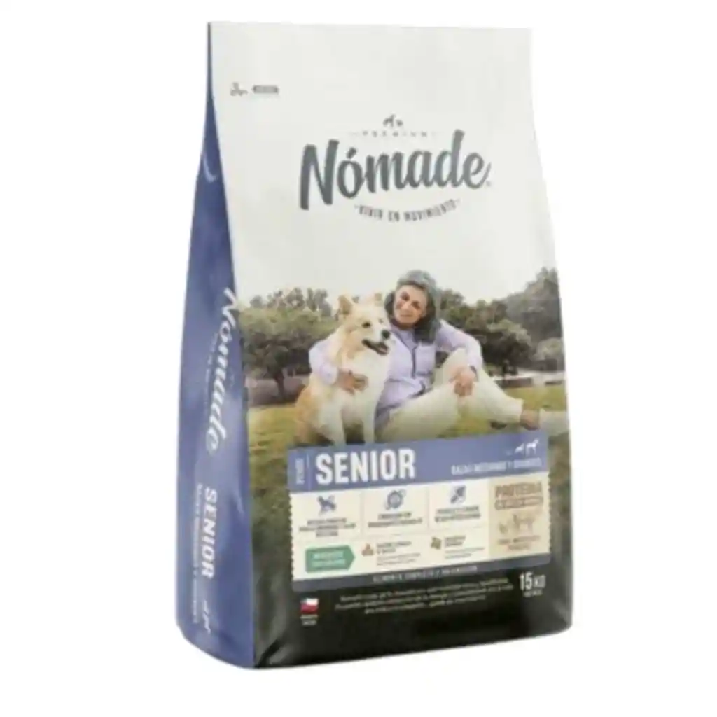 Alimento Nómade Senior para perros medianos y grandes, con proteínas de alta calidad, antioxidantes naturales y cuidado articular. Nutrición especializada para perros senior Nómade Senior para razas medianas y grandes está formulado pensando en las necesidades específicas de los perros en etapa madura. Su receta equilibrada fortalece articulaciones, protege la salud intestinal y potencia la vitalidad diaria, garantizando una vida plena y activa. Defensa bioactiva para inmunidad y digestión Gracias a la incorporación de ingredientes funcionales como MOS (manano-oligosacáridos), cultivos de levaduras, postbióticos, nucleótidos y extracto de quillay, tu perro recibe un apoyo integral para mantener un sistema inmune fuerte y una digestión eficiente. Estos componentes también ayudan a mejorar la absorción de nutrientes y el equilibrio intestinal. Antioxidantes naturales para un envejecimiento saludable Este alimento está enriquecido con antioxidantes naturales provenientes del extracto de romero, tocoferoles y el poderoso maqui chileno, reconocido por su acción cardio-protectora, antiinflamatoria y reguladora del metabolismo de la glucosa y el colesterol. Todo esto contribuye a mantener a tu perro activo y protegido frente al paso del tiempo. Cuidado articular en cada bocado La glucosamina y el sulfato de condroitina trabajan en conjunto para mantener la estructura y función de los cartílagos, favoreciendo la movilidad y reduciendo el desgaste articular, algo fundamental en perros senior de razas medianas y grandes. Salud bucal y encías más fuertes El hexametafosfato de sodio (HMF) ayuda a reducir la formación de sarro, logrando dientes más blancos y encías más sanas. De esta manera, tu perro disfruta de una mejor salud oral y un aliento fresco. Piel sana, pelaje brillante y mente activa Con la combinación de ácidos grasos Omega 3 y 6 junto al zinc orgánico, este alimento apoya la protección de la piel, mantiene un pelaje más fuerte y sedoso, y contribuye al buen funcionamiento del sistema nervioso, mejorando la agilidad mental de tu perro en su etapa senior. Ingredientes naturales y sin colorantes artificiales Formulado con ingredientes de origen natural y libre de colorantes artificiales, Nómade Senior asegura una nutrición confiable, segura y respetuosa con el organismo de tu mascota.