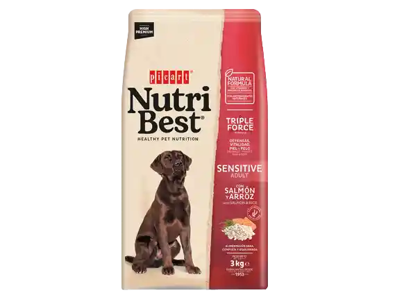 Nutribest Adult Sensitive with Salmon and Rice: Nutrición Premium para Perros Adultos (12 meses) Nutribest Adult Sensitive con Salmón y Arroz es un alimento High Premium especialmente formulado para perros adultos con sensibilidades alimentarias. Con una receta que incluye salmón como fuente principal de proteína, este alimento favorece una digestión suave y proporciona todos los nutrientes esenciales para una vida activa y saludable. Su fórmula incluye Algas Marinas del Atlántico Norte, que cuidan la piel y el pelaje de tu perro, asegurando que se mantenga saludable y brillante.
