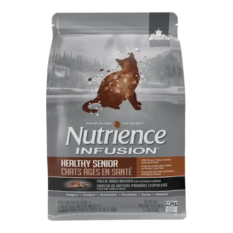 Nutrience Infusion Gato Senior es un alimento especialmente diseñado con los mejores ingredientes canadienses para satisfacer las necesidades nutricionales de los gatos adultos mayores. Este alimento está formulado con una mezcla única de pollo fresco y pollo liofilizado, asegurando un sabor y nutrición superiores que incluso los gatos más exigentes desearán. Ingredientes: Pollo deshuesado, harina de pollo, cebada perlada, lentejas, guisantes, avena, harina de cerdo, sabor natural de pollo, alfalfa secada al sol, grasa de pollo, cloruro de colina, propionato de calcio (conservante), aceite de pescado, lecitina, taurina, pollo liofilizado, aceite de coco, raíz de achicoria seca, extracto de levadura, cloruro de potasio, sal, DL-metionina, L-lisina, extracto de Yucca schidigera, hidrocloruro de glucosamina, carbonato de calcio, zinc proteinado, sulfato de zinc, suplemento de vitamina E, sulfato de condroitina, L-carnitina, sulfato ferroso, proteína de hierro, manzana, arándano, zanahoria, arándano rojo, raíz de jengibre, calabaza, suplemento de niacina, producto de fermentación seca de Bifidobacterium bifidum, producto de fermentación seca de Enterococcus faecium, producto de fermentación seca de Lactobacillus acidophilus, producto de fermentación seca de Lactobacillus casei, sulfato de cobre, proteína de cobre, suplemento de vitamina A, proteína de manganeso, pantotenato de calcio D, complejo de bisulfito de menadiona sódica, mononitrato de tiamina, clorhidrato de piridoxina, suplemento de riboflavina, óxido de manganeso, biotina, yodato de calcio, selenito de sodio, suplemento de vitamina B12, suplemento de vitamina D3, ácido fólico, extracto de romero, conservado con tocoferoles mixtos y ácido cítrico.