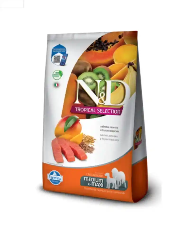 Salmón (carne mecánicamente separada de salmón, harina de salmón – mín. 5%), harina de pescado, harina de vísceras de pollo, harina de chicharrón (piel de cerdo), huevo en polvo, aceite de pollo, aceite de pescado, sub-producto de arroz, cereales y frutas (avena, granos de sorgo, cebada en granos, plátano deshidratado, papaya deshidratada, kiwi deshidratado, mango deshidratado – mín. 35%), sub-producto de trigo, pulpa de remolacha, levadura seca de cervecería (Saccharomyces cerevisiae), zanahoria deshidratada, aditivos prebióticos (FOS y MOS), DL-metionina, taurina, L-carnitina, sulfato de condroitina, sulfato de glucosamina, aditivos adsorbentes ( extracto de yuca (Manihot esculenta) y zeolita), hidrolizado de hígado de aves y cerdos, vitaminas (A, D3, E, B1, B2, B5, B6, B12, C, biotina, niacina, ácido fólico, cloruro de colina), cloruro de sodio, cloruro de potasio, hierro aminoácido quelato, cobre aminoácido quelato, zinc aminoácido quelato, manganeso aminoácido quelato, proteinato de selenio, yodato de calcio, propionato de calcio, concentrado de tocoferoles.