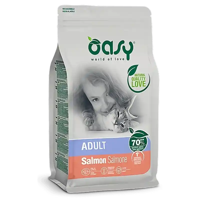 Brinda a tu gato una alimentación que cuida su bienestar en todas las etapas de su vida. Oasy Lifestage Adult Salmon no solo ofrece un pelaje brillante y una piel sana, sino que también promueve una digestión adecuada y contribuye al buen funcionamiento cardíaco y muscular. Tu gato merece lo mejor, y eso es exactamente lo que nuestro alimento le brinda.