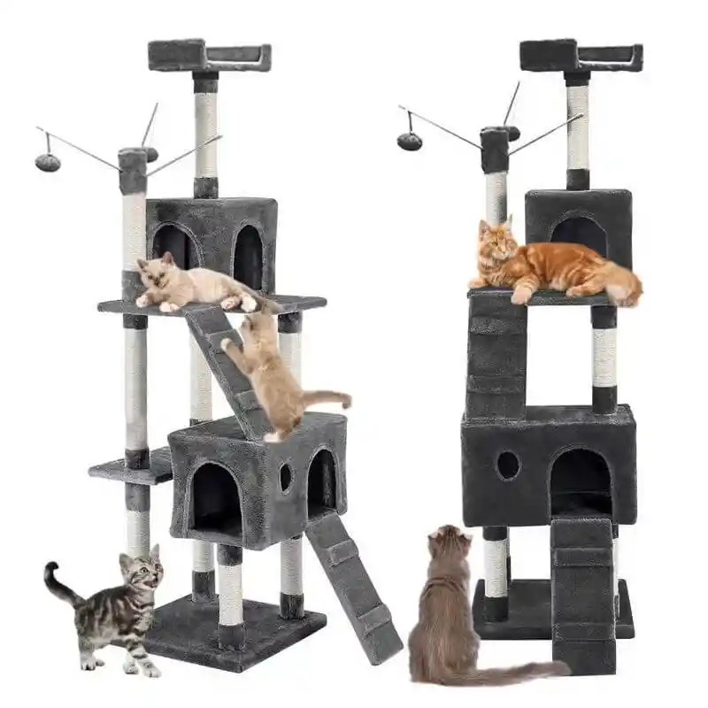 Olina Rascador Árbol Rascacielos es un hermoso rascador para gatos. Con él, tu gatito podrá tener un espacio único donde disfrutar y relajarse. Equipado con dos casitas, un gran mirador, juguetes y varias columnas forradas en sisal convertirán este rascador en el preferido de tus gatos. Medidas: 50 x 50 x 170 cm.