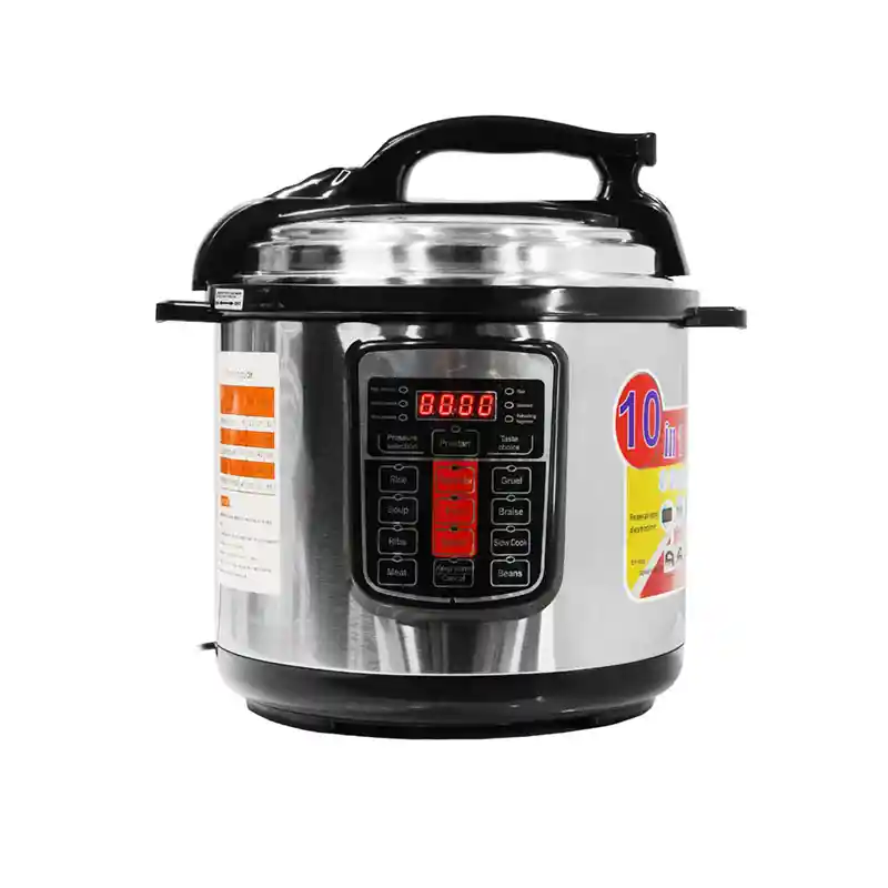 La olla a presión eléctrica es una nueva herramienta de cocina desarrollada con última tecnología. El producto ha combinado las excelentes cualidades de la olla a presión, la olla eléctrica y la olla para estofar. Cuenta con control programable de temperatura y presión con una estructura y un diseño de perspectiva nuevos y distintivos. Es un funcionamiento confiable y seguro, ahorra energía y ofrece una cocción de calidad. Es una herramienta de cocina ideal para una familia moderna y un excelente sustituto de la olla a presión convencional. Funciones combinadas de cocción, guisado y estofado. El rango de tiempo está etiquetado en la perilla. Puede hacerlo de acuerdo con la comida y el gusto personal y la experiencia culinaria. Ahorro de tiempo y energía. Ahorro de energía y tiempo en más del 60% que las cocinas eléctricas comunes. La cocción hermética conserva los nutrientes y el sabor original. Olla interior antiadherente, fácil de limpiar. La tapa y el tanque exterior de acero inoxidable garantizan una larga vida útil. 5 funciones de seguridad integradas: 1) Bloqueo automático de la tapa: la olla no puede ganar presión cuando la tapa no está bien cerrada y la tapa no se puede abrir cuando la presión interior es demasiado alta. 2) Función de alivio automático de presión: cuando la temperatura y la presión dentro de la olla superan el valor normal, la válvula de descarga de presión descargará el vapor para regular. 3) Función de despresurización: cuando falla el límite de presión dentro de la olla y la presión supera el límite, la olla despresuriza automáticamente alrededor de la tapa para evitar una explosión. 4) Límite de temperatura: La energía se corta automáticamente cuando la temperatura dentro de la olla supera la temperatura preestablecida. 5) Seguro para temperaturas ultra altas: la energía se corta automáticamente cuando la temperatura dentro de la olla supera el valor límite. =220-240v 50/60Hz. =1000-1190w
