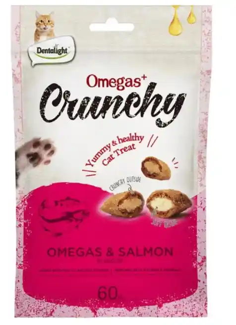 Descubre la delicia crujiente que a tus gatos les encantará y que tú también disfrutarás al verlos felices y saludables. ¡Dentalight Omegas Crunchy Salmón es la elección perfecta para consentir a tus gatos mientras les brindas lo mejor para su bienestar! Características: Elaborado con auténtico Salmón. Textura irresistiblemente crujiente por fuera. Delicioso centro suave que atrae a los gatos. Menos de 2 calorías por bocadillo, ideal para una alimentación saludable. Enriquecidos con aceite de pescado y polvo de huevo, fuentes naturales de omega. Promueven una piel y pelaje saludables gracias a su contenido de omega. Fortificados con vitaminas y minerales esenciales para el desarrollo y la salud. Perfectos para premiar a tu mascota o para entrenamiento. Atractivo sabor que los gatos adoran. Fácil de usar y transportar, ideal para llevar de viaje o mantener en casa.| Ingredientes Atún, pollo, arroz integral, proteína de trigo, harina de trigo, proteína de maíz, grasas animales, remolacha azucarera, huevo en polvo, aceite de pescado. Aditivos sensoriales: Sabor a atún Componentes analíticos Proteina bruta 30% Grasa bruta 17% Fibra bruta 3% Ceniza bruta 8% Humedad 12% Contenido calórico (EM calculado): 372.62Kcal/100g