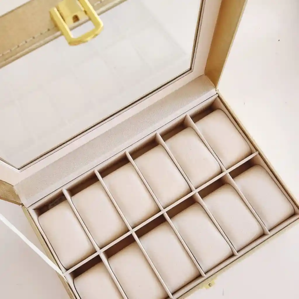 Organiza y protege tus relojes con nuestra nueva caja golden! 🖤 Está diseñada para guardar 12 relojes, pero también puedes usarla como joyero removiendo sus almohadillas. Color exterior: dorado Color interior: arena Material exterior: cuero vegano y vidrio Material interior: forrado con tela suave