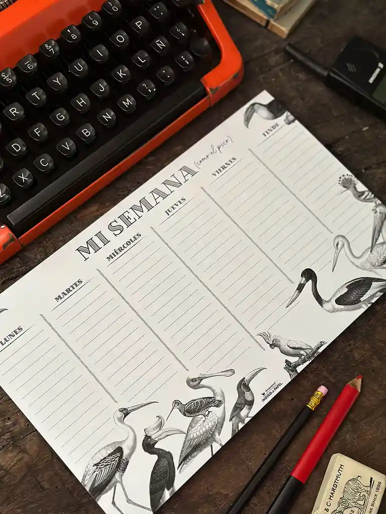 Planificador Semanal. Formato 31x18.5 cm. 55 hojas por taco Papel Blanco 140g. Base cartón madera gris 1.2mm
