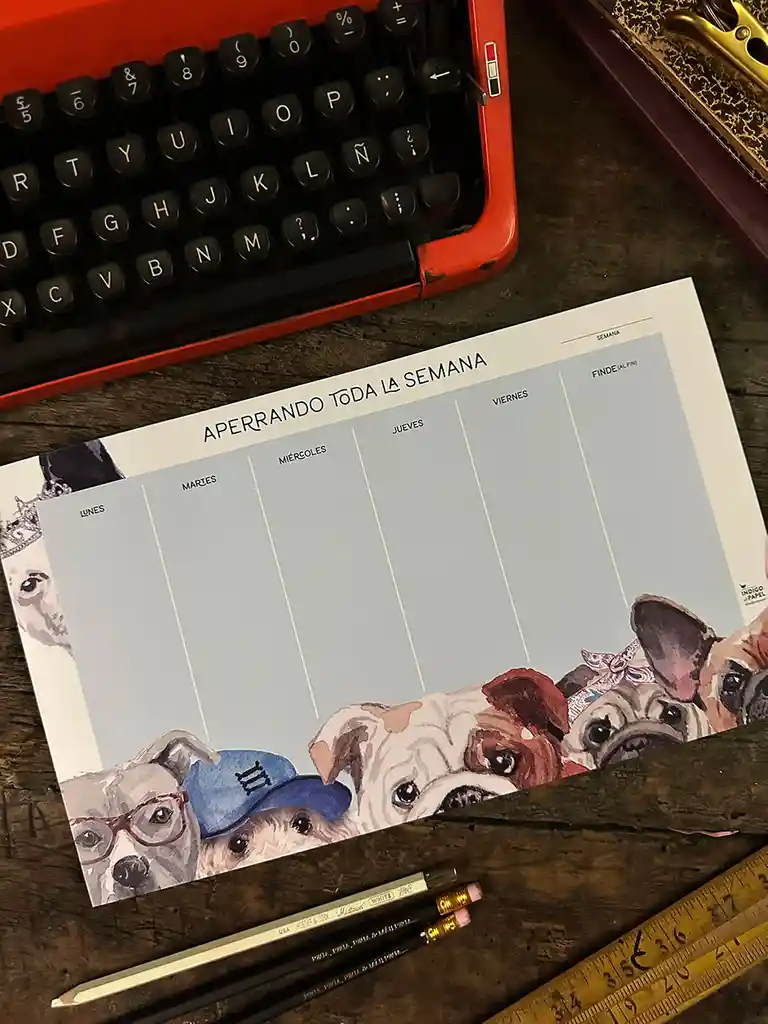 Planificador Semanal. Formato 31x18.5 cm. 55 hojas por taco Papel Blanco 140g. Base cartón madera gris 1.2mm