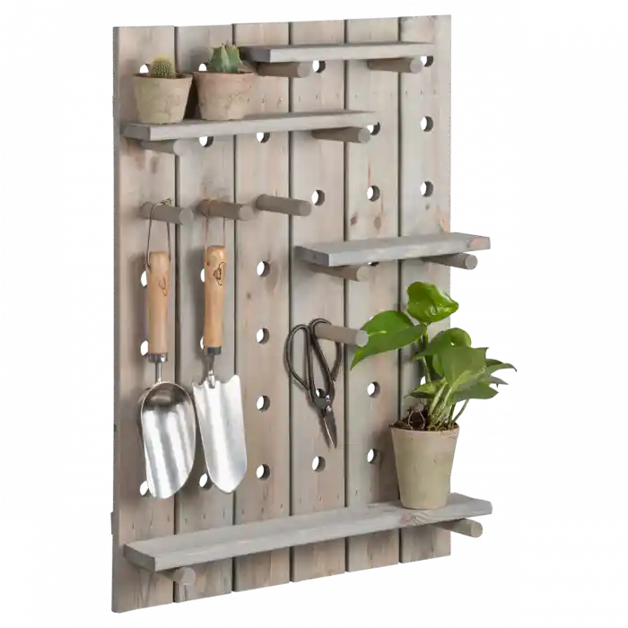 Este organizador de madera multipropósito es ideal para que lo cuelgues en un muro, lo armes y organices como mejor te acomode. Puedes usarlo para organizar tú terraza o huerto, colocar macetas, colgar tus herramientas, o para darle un estilo rústico a tú cocina o taller. Dale el uso y diseño que necesites. Incluye 4 repisas y 8 palos de madera para que lo armes a tu pinta. Medidas: Altura 78.1 y ancho 56.4 cms.