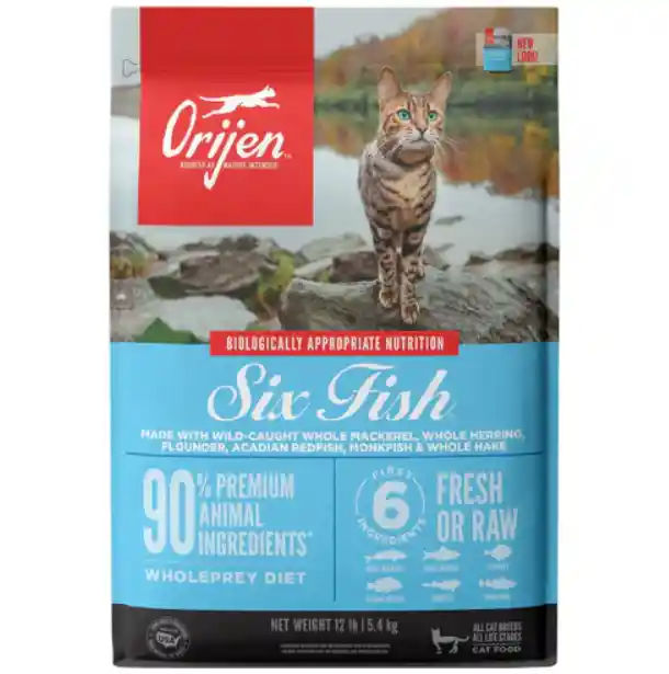 Orijen Six Fish Cat es un alimento biológicamente apropiado™ indicado para todos los gatos en todas las etapas de su vida. Con 40% de proteína rica en nutrientes, y limitado a 18% de carbohidratos de bajo índice glucémico. Formulado con pescados frescos de Nueva Inglaterra.  Repleto con un 40% de nutritiva proteína, y limitando a un 18% los carbohidratos de bajo índice glicémico para nutrir a los gatos y gatitos de acuerdo a sus necesidades biológicas y evolutivas. 2/3 de los pescados son FRESCOS (refrigerados sin preservantes) o CRUDOS (ultra-congelados, sin preservantes), incluyendo los 6 principales ingredientes de pescado. Fórmula densa en nutrientes, las proporciones de PresaEntera de pescados frescos y enteros (incluyendo carne, órganos y cartílago) son una fuente natural de prácticamente todos los nutrientes que tu gato necesita para crecer – solo se agregan: colina, zinc y cobre. Los pescados secos son especialmente preparados a 200°F cuando están frescos, enteros y recién capturados, con el propósito de crear una concentrada fuente de nutritiva proteína que ni el pescado fresco puede ofrecer. Las infusiones liofilizadas de hígado de bacalao enaltecen el sabor naturalmente, haciendo de ORIJEN toda una exquisitez, aún para las mascotas más exigentes. Ingredientes: Salmón fresco sin espinas (20%)*, harina de salmón (17%), harina de arenque (10%), arenque fresco sin espinas (8%)*, lucioperca fresco y sin espinas (5%)*, coregonus fresco y sin espinas (5%)*, aceite de salmón (preservada con tocoferoles) (5%), harina de coregonus, papas Russet, batata, guisantes, alfalfa madurada el asol, fibra de guisantes, lenguado fresco y sin espinas*, lucio europeo fresco y sin espinas, algas orgánicas, calabaza, zanahorias, espinacas, grelo, manzanas, arándanos, moras azules, raíz de regaliz, raíz de angélica, fenogreco, caléndula, hinojo dulce, hojas de menta, manzanilla, diente de león, ajedrea, romero, vitamina A, vitamina D3, vitamina E, niacina, tiamina, riboflavina, calcio, piridoxina, ácido fólico, biotina, vitamina B12, zinc, hierro, manganeso, cobre, selenio, Lactobacillus acidophilus, Enterococcus faecium (bacterias del ácido láctico).  * Llegan frescos - sin conservantes y nunca congelado