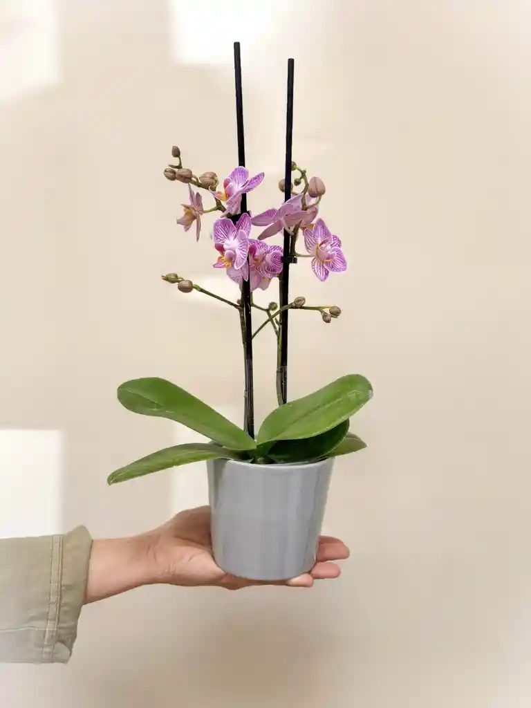 Orquídea Phalaenopsis multiflora de dos varas, presentada dentro de macetero de cerámica. Orquídea disponible en varios colores, sorpréndete con la variedad del día. Altura aproximada de 25-30 cms. Por ser una planta natural, cada orquídea es diferente a la otra. Tips de Cuidado: Es una planta de interior. No cambiar el sustrato (no agregar ningún tipo de tierra). No exponer al sol directo. Temperatura promedio 20° (rango de 16° a 30°) ¿Cuándo regar? Cuando la raíz está de color blanco grisáceo. Cuando el sustrato está completamente seco (se puede probar introduciendo el dedo unos 2 cms en el musgo. Si se percibe humedad aún, no se debe regar). Se riega en promedio cada 7 a 10 días, depende del ambiente. Dejar escurrir completamente el agua. En días calurosos se sugiere además del riego pulverizar con agua las hojas. No mojar las flores.
