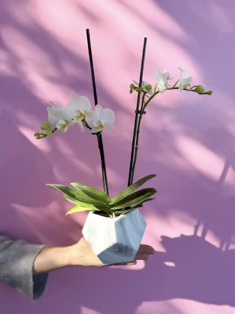 Orquídea Phalaenopsis multiflora de dos varas, presentada dentro de macetero de cerámica. Orquídea disponible en varios colores, sorpréndete con la variedad del día. Altura aproximada de 25-30 cms. Por ser una planta natural, cada orquídea es diferente a la otra. Tips de Cuidado: Es una planta de interior. No cambiar el sustrato (no agregar ningún tipo de tierra). No exponer al sol directo. Temperatura promedio 20° (rango de 16° a 30°) ¿Cuándo regar? Cuando la raíz está de color blanco grisáceo. Cuando el sustrato está completamente seco (se puede probar introduciendo el dedo unos 2 cms en el musgo. Si se percibe humedad aún, no se debe regar). Se riega en promedio cada 7 a 10 días, depende del ambiente. Dejar escurrir completamente el agua. En días calurosos se sugiere además del riego pulverizar con agua las hojas. No mojar las flores.