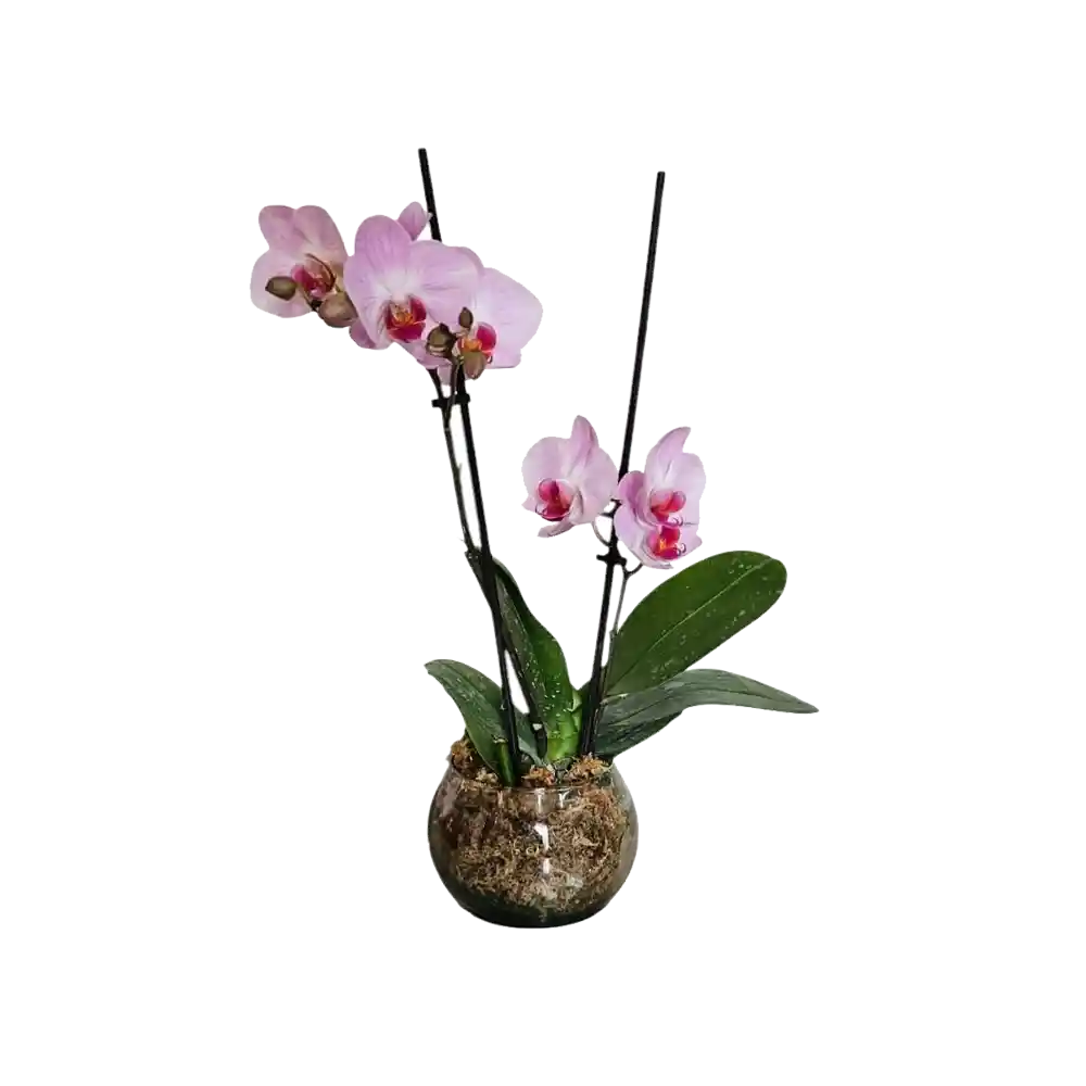 Hermosa orquídea en color lila jaspeado en pecera de vidrio, doble vara Medidas aproximadas 35cm de alta