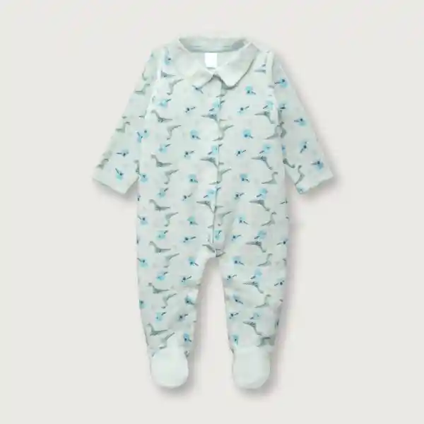 Plush en Color Celeste Con Cuello Camisero en Color Blanco Broches en la Partte Delantera Para Una Facil Postura Full Estampado de Dinosaurios en Tonos Azul y Turquesa.