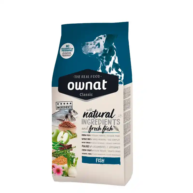 Ownat Classic Fish es un alimento completo y equilibrado para perros adultos elaborado con pescado como principal fuente de proteína animal. Su receta está formulada con ingredientes naturales cuidadosamente seleccionados, lo que asegura una nutrición de calidad y una alta digestibilidad. Gracias al aporte de ácidos grasos omega 3 y omega 6 provenientes del pescado, este alimento favorece una piel sana y un pelaje brillante, ideal para perros con pieles sensibles o problemas dermatológicos leves. Sin colorantes, conservantes, ni aditivos artificiales.