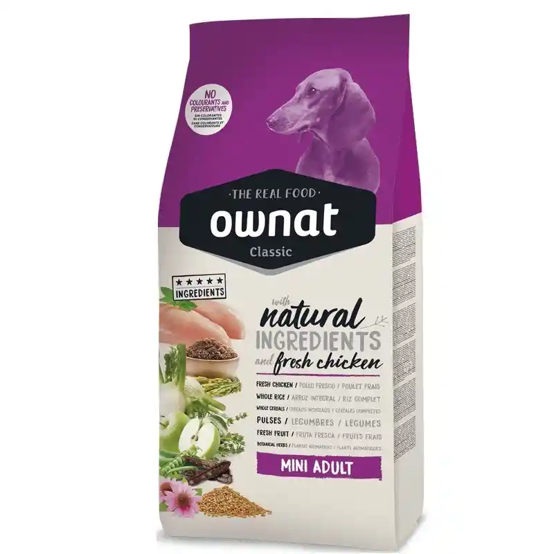 COMPOSICIÓN: Carnes 34% (carnes deshidratadas 24%, pollo fresco* 10%), trigo integral* (18%), grasa de pollo, maíz integral* (8%), cebada integral* (8%), salvado de trigo* (5%), arroz integral* (5%), guisantes enteros* (4%), garrofa* (2%), manzana fresca* (1%), aceite de salmón, semilla de lino* (1%), pulpa de remolacha, fructo y manano oligosacáridos, levadura de cerveza* (0,5%), hierbas botánicas 0,02% (hinojo*, equinacea*, tomillo*), extracto de yuca shidigera. *Ingredientes naturales COMPONENTES ANALITICOS: Proteína 26%, Contenido en grasa 13%, Fibras brutas 3%, Materia inorgánica 7,5%, Humedad 8%, Calcio 1,5%, Fosforo 1%. Destinado a perros entre 1 kg y 10 kg en edad adulta, está especialmente formulado con elevados aportes calóricos y muy rico en proteínas para dar respuesta a los altos requerimientos de las razas mini. Sus croquetas de forma y tamaño reducidos, así como su gran apetitosidad lo hace adecuado para los paladares más caprichosos. ADITIVOS/KG: Aditivos nutricionales: Vitamina A 18.000 UI, Vitamina D3 1.500 UI, Vitamina E 90 UI, Vitamina C 100 mg, Cobre (Quelato de cobre de aminoácidos hidratado) 4 mg, Manganeso (Óxido manganoso) 38 mg, Zinc (Óxido de zinc) 100 mg, Hierro (Sulfato ferroso, monohidratado) 30 mg, Zinc (Quelato de Zinc de aminoácidos hidratado) 7,5 mg, Iodo (Ioduro potásico) 3 mg, Selenio (selenito sódico) 0,2 mg. Con antioxidantes naturales.