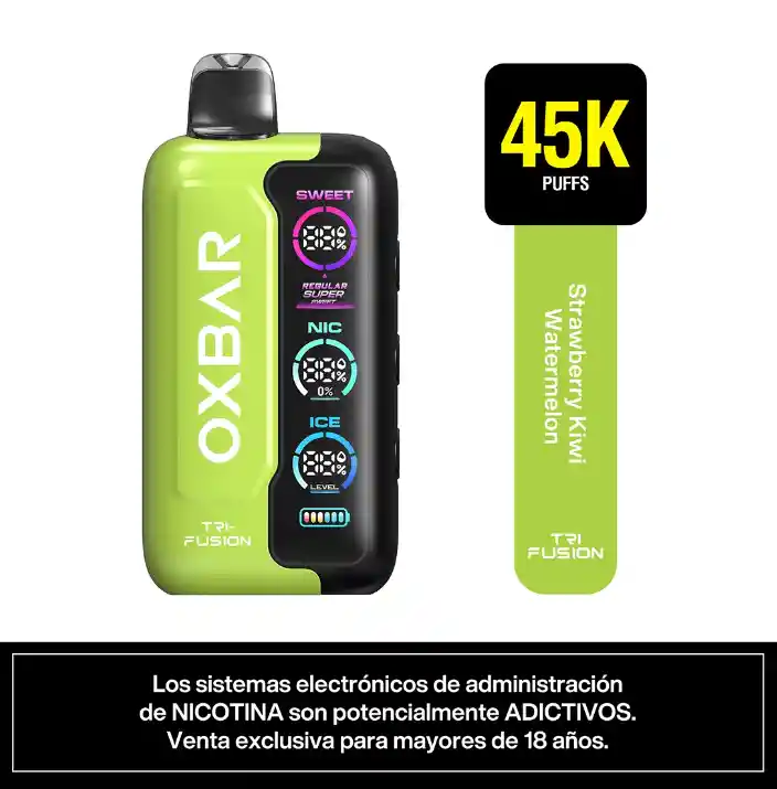 El Oxbar Tri Fusion 45K Puffs – Strawberry Kiwi Watermelon es el primer desechable con un innovador sistema “Triple Tank Control” que te permite personalizar cada vapeada como nunca antes. Ajusta de forma independiente los niveles de la nicotina, el sabor y el ice con solo tocar un botón y disfruta siempre de tu mezcla perfecta. Este modelo destaca por su combinación tropical: frutilla, kiwi y sandía, que brinda un perfil frutal y refrescante en cada calada.