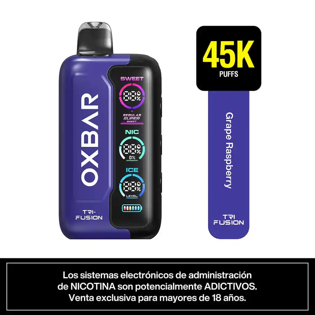 Descubre una nueva forma de vapear con el Oxbar Tri Fusion 45K Puffs. Gracias a su exclusivo Triple Tank Control, puedes modificar nicotina, intensidad de sabor y frescura (ice) de manera independiente, logrando siempre la mezcla perfecta según tu preferencia. Innovación, personalización y máxima duración en un solo dispositivo.