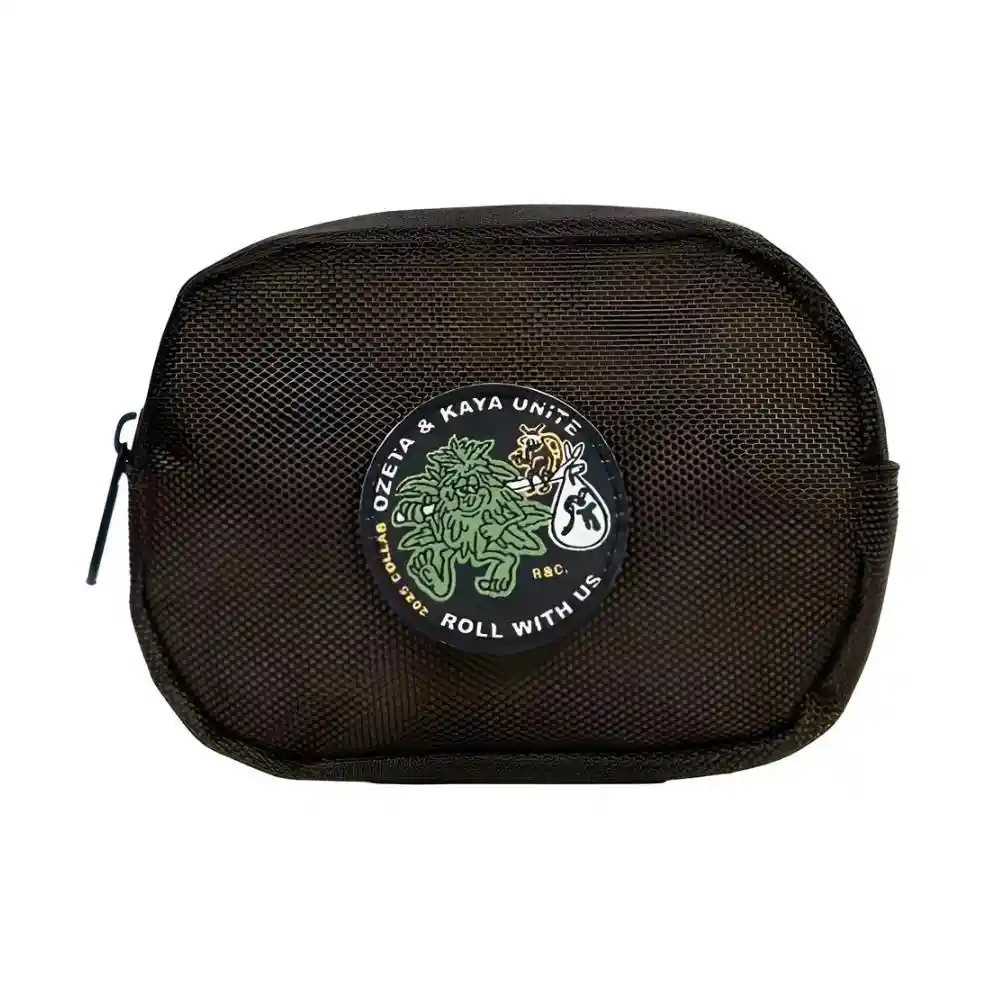 Estuche mediano OZeta x Kaya Unite con tecnología CDO (filtro de carbón activado + cierre hermético) para control de olores. Incluye clip metálico removible y kit multiuso pequeño. Diseño exclusivo con parches bordados. Tamaño práctico y funcional para uso diario.