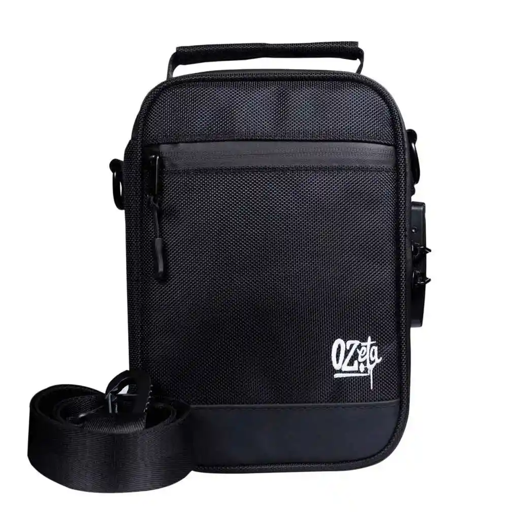 Lonchera rígida OZeta con sistema antiolor y cierre con clave. Incluye compartimentos removibles, manija y correa ajustable. Medidas 25 x 18 x 11 cm. Ideal para organizar y transportar accesorios.