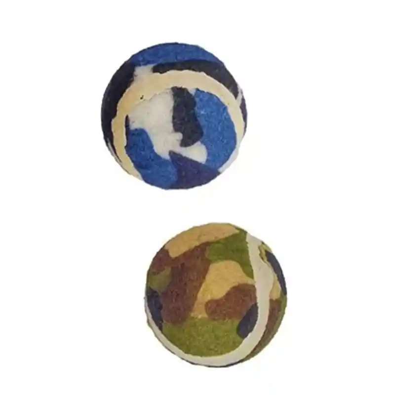 . Pelotas de tenis hechas para mascotas para el juego de buscar. . Los colores brillantes proporcionan una mejor visibilidad al jugar con su perro y ayudan a evitar que se pierda la pelota. . Ideal para juego de mascota y su tutor. . Menos rebote que la pelota de tenis estándar. Especificaciones: . Diseño:Camuflado . Color: Pack Azul/verde . Diámetro: 7 cm. . Contenido: 2 pelotas.