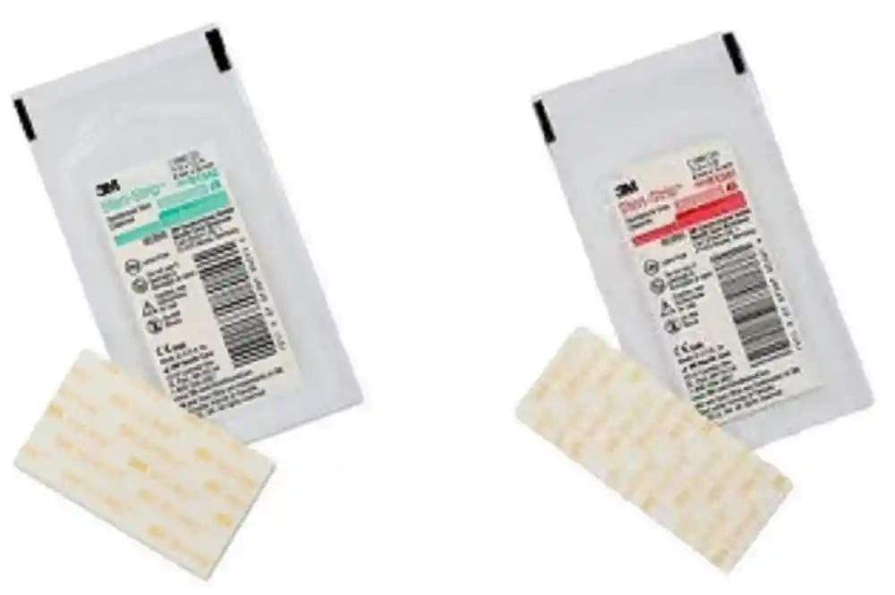 Puntos de Papel para afrontamiento cutáneo Las suturas cutáneas adhesivas Steri-Strip están fabricadas en un material poroso, no tejido. Las suturas están reforzadas con filamentos que le proporcionan resistencia y están recubiertas con un adhesivo hipoalergénico. Usos Específicos Las suturas cutáneas adhesivas Steri-Strip están indicadas para usarse como dispositivos de cierre de la piel en el tratamiento de incisiones quirúrgicas y laceraciones. Las suturas cutáneas adhesivas Steri-Strip también pueden usarse conjuntamente con suturas y grapas cutáneas o, después de su remoción, para apoyar el cierre de heridas. Contraindicaciones Las suturas cutáneas adhesivas Steri-Strip están contraindicadas en los lugares donde no se puede tener adhesión. Las causas posibles de una adhesión inadecuada son la presencia de exudado, piel aceitada, o exceso de vello. El uso de las suturas cutáneas adhesivas Steri-Strip está contraindicado sobre las heridas infectadas. Las suturas cutáneas adhesivas Steri-Strip están contraindicadas para usar en heridas de alta tensión cuyos bordes no puedan ser aproximados fácilmente con los dedos o pinzas.