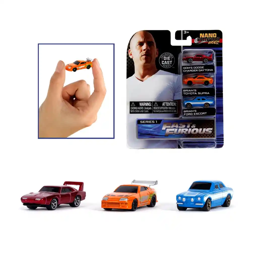 El pack de 3 autos nano de 4 cm inspirados en los autos de las películas Rápido y Furioso, serán todo lo que los amantes a los autos necesitan. Cada uno está diseñado con detalles auténticos y altamente realistas que van desde el guardafango hasta el parachoques, contando con ruedas de libre acción para que puedan deslizarlo sobre cualquier superficie ideales para darles vida a través del juego o para coleccionar y exhibir. Este juguete fomenta de una manera divertida la creatividad, la imaginación y contribuye al desarrollo de nuevas habilidades y hobbies.