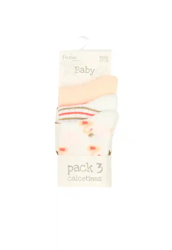 Pack 3 calcetines bebé niña ficcus 649 Talla: 20/22 Género: Niña Modelo :Ri Composición: 75% Algodón 23% Polyamida 2% Elastano Garantía: 6 meses Cuidados de la prenda: Lavado con agua a tº máxima de 30º. No blanquear. No secar a máquina. Planchar a temperatura baja