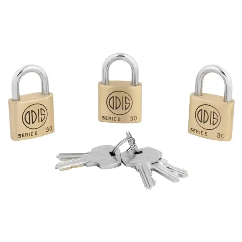 - 3 candados de 30mm - Cuerpo de bronce sólido - Gancho de acero - Sistema de cierre con doble eslabón - Incluye 6 copias de llave estándar - Resistencia al corte de gancho por compresión - Resistencia a la tracción del gancho - Resistencia al corte de sierra