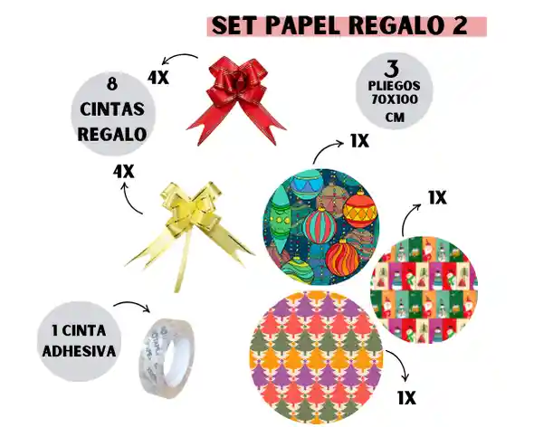 El set incluye 3 pliegos de papel de regalo navideño (los de la imagen), 8 cintas de regalo (4 de cada color) y una cinta adhesiva. Todo para envolver tus regalos de navidad!