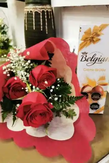 Pack compuesto por 3 rosas mas cajita de bombones Belgian o similar, colores segun stock, foto referencial Rosas de color Rojo ideal para el Amor