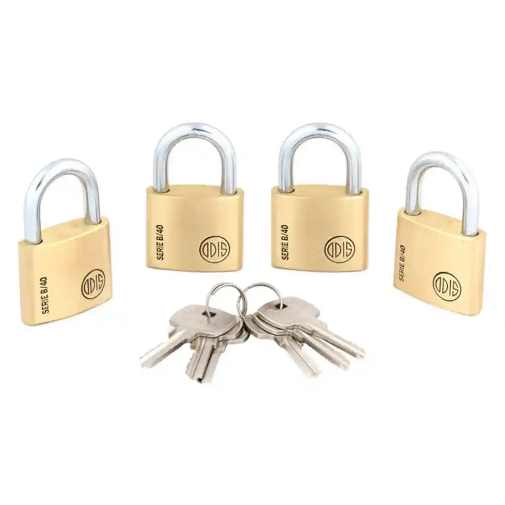 - 4 candados de 40mm - Cuerpo de bronce sólido - Gancho de acero - Sistema de cierre con doble eslabón - Incluye 3 copias de llave estándar - Resistencia al corte de gancho por compresión - Resistencia a la tracción del gancho - Resistencia al corte de sierra