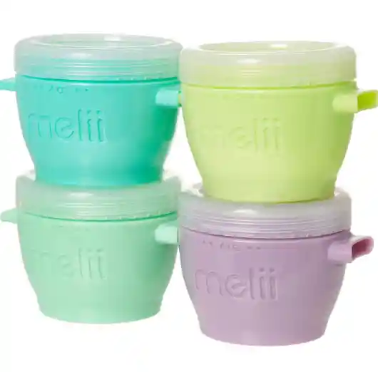 El pack de cuatro contenedores Snap & Go de Melii son ideales tanto para llevar pequeñas colaciones como para guardar y congelar las porciones de alimento de tu bebé. Los contenedores se unen entre sí horizontalmente y se apilan verticalmente, lo que facilita su instalación en el congelador. Aptos para el lavavajillas y muy fáciles de limpiar. Cubierta hermética y a prueba de fugas ayuda a prevenir derrames y quemaduras por congelación Capacidad: 4 oz/118 ml Apto para microondas, congelador y estante superior para lavavajillas. Sin BPA, sin plomo, sin PVC, sin cadmio.