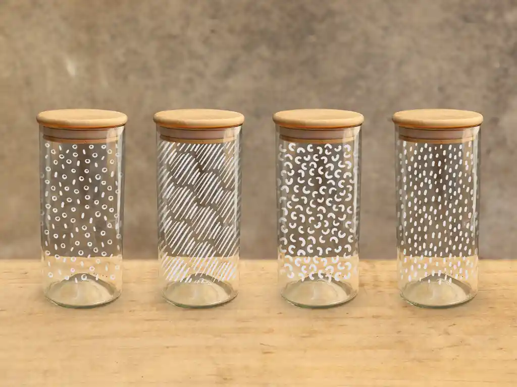 Ahora vas a poder ordenar tus cositas con más estilo con nuestros contenedores! Son ideales para guardar alimentos como cereales, pastas, azúcar, o cualquier cosa de otro espacio del hogar. La mejor parte? Cuando se vacíe tu frasco tendrás un lindo vasito 😍 Cada uno incluye una tapa hermética de bambú. El precio es por el pack de 4 unidades