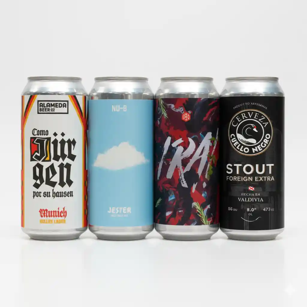 Pack Mix 4 cervezas Sin caja de regalo 🚨¡No incluye caja de regalo! 🚨 GRANIZO IRA! (IRA) JESTER LA NU-B (Hazy Pale Ale) ALAMEDA COMO JURGEN POR SU HAUSEN (Munich Helles Lager) CUELLO NEGRO STOUT (Foreign Extra Stout) 🤷♂️🤷♀️¿Por qué elegir nuestro Pack Clásico? Este pack reúne cuatro estilos diferentes, cada uno con su propia personalidad, para que disfrutes de un viaje sensorial que no dejará indiferente a tu paladar. Perfecto para compartir, descubrir nuevos sabores o simplemente para darte ese gustito que mereces. Qué cervezas contiene este box? ⚪️La primera de esta selección es una clásica Munich Helles Lager, Como Jurguen por su hausen, de hermosa apariencia cristalina e impecable espuma, es definitivamente la más refrescante de este box. ☁️Siguiendo con la frescura propia de las Hazy, Nu-B de Jester es una Hazy Pale Ale que destaca por su cuerpo turbio y carácter tropical, ideal para los amantes del lúpulo. 🔴En tercer lugar y no por eso menos importante, tenemos en este box a la exótica Ira!, India Red Ale de Granizo riquísima en sabor y notas distintivas, lo que la hace una cerveza imperdible para todo conocedor del mundo artesanal. ⚫️Finalmente coronamos con una campeona global, directamente de Valdivia traemos a este box a la más maltosa de todas, Cuello Negro Stout, es una cerveza negra con cuerpo robusto y exquisitas notas a café. ¡Si por algún motivo desconocido e improbable está selección no te convence tenemos decenas de packs, te invitamos a seguir buscando entre nuestra vasta variedad! 😎⭐️Cada una de estas cervezas tiene su propia historia, su propio estilo y un lugar especial en esta selección. Así que abre una lata, siéntate y disfruta de este viaje cervecero que hemos preparado para ti. ¡Salud! 🍺🍻