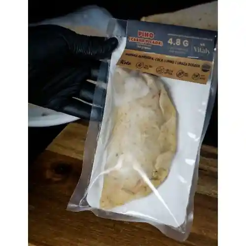 5 Empanadas de pino de 150 g c/u Harinas (lupino, coco, linaza dorada, almendra), agua filtrada, psylluim husk, goma xantana, polvos de hornear, aceite de oliva extra virgen, vinagre de manzana orgánico, carne de vacuno (posta negra), cebolla, aceituna negra deshuesada, huevo, especias (ajo, pimentón, cilantro, cebollín, perejil, sal rosada del himalaya, comino, eneldo, pimienta negra y orégano), vino tinto y bicarbonato de sodio.Sin saborizantes químicos, sin colorantes artificiales, ni conservantes. Ketofriendly, sin gluten, sin lactosa, sin lácteos, ni soya. Sin harinas refinadas. Al tener una harina libre de procesados tiene un impacto glucémico menor a otras empanadas, lo que la hace apta para personas con diábetes o con resistencia a la insulina. Baja en carbohidratos 4,8 g de carbohidratos por porción. Rica en proteína una sola porción genera saciedad. Enriquecida con caldo de huesos de libre pastoreo para dar sabor y propiedades nutritivas a esta receta tradicional. Ingredientes 100% naturales, seleccionados. Sin químicos, colorantes ni saborizantes artificiales. Producto congelado, listo para llevar al horno a llama bajo. Cómo consumirla: Producto congelado, listo de llevar al horno a llama bajo. Se pueden descongelar y llevar al horno, después dejar hornear a llama lenta 180 °C aprox., durante 25 minutos o hasta que esté dorada al gusto. Retírala del horno y dejar reposar por 10 minutos. Si después de sacar del horno no se dejan reposar, por estar muy calientes se partirán. No meter en microondas. Al no tener conservantes las empanadas duran refrigeradas hasta 3 días, congeladas durante 3 meses sin afectar textura ni sabor. Después de descongelar no volver a congelar.