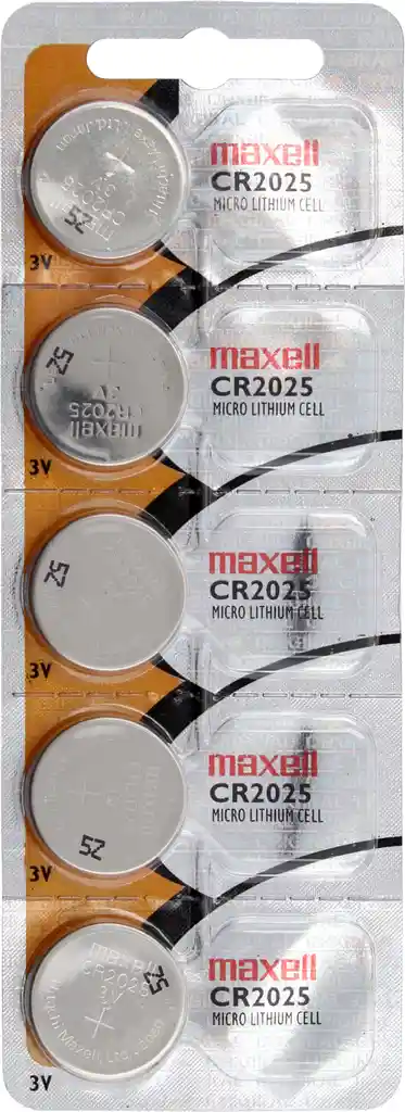 Pila de reloj o calculadora CR2025 Marca Maxell Lithium de 3 volt. blíster de 5 unidades, ideal para reloj, alarmas, calculadoras, balanzas digitales, placas madres, etc. Tipo: Pila de Botón CR2025 Cantidad: 5 Celda: Litio-metal Voltaje: 3V Capacidad: 80mAh Dimensiones: 20x1,6mmPeso: 0.8g (cada pila)