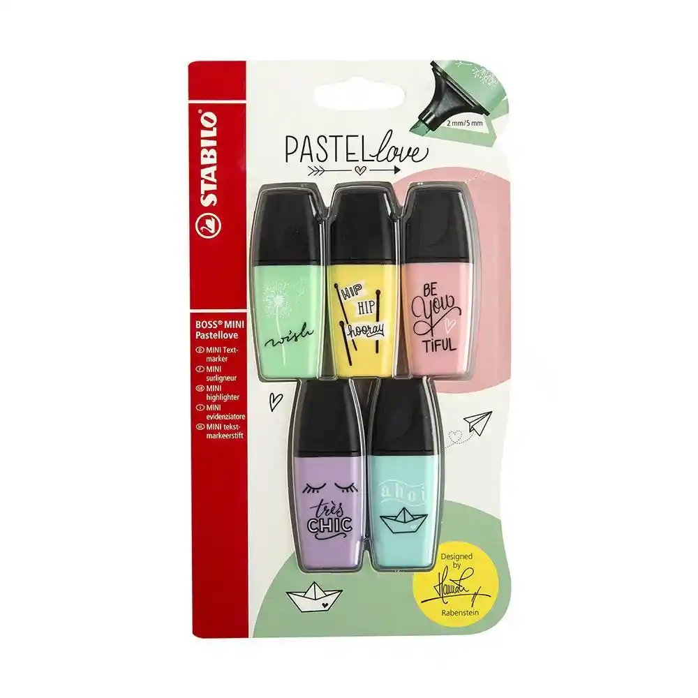 Set de 5 mini destacadores Stabilo Boss Mini pastel Love, con hermosas ilustraciones de la artista Hannah Rabenstein.