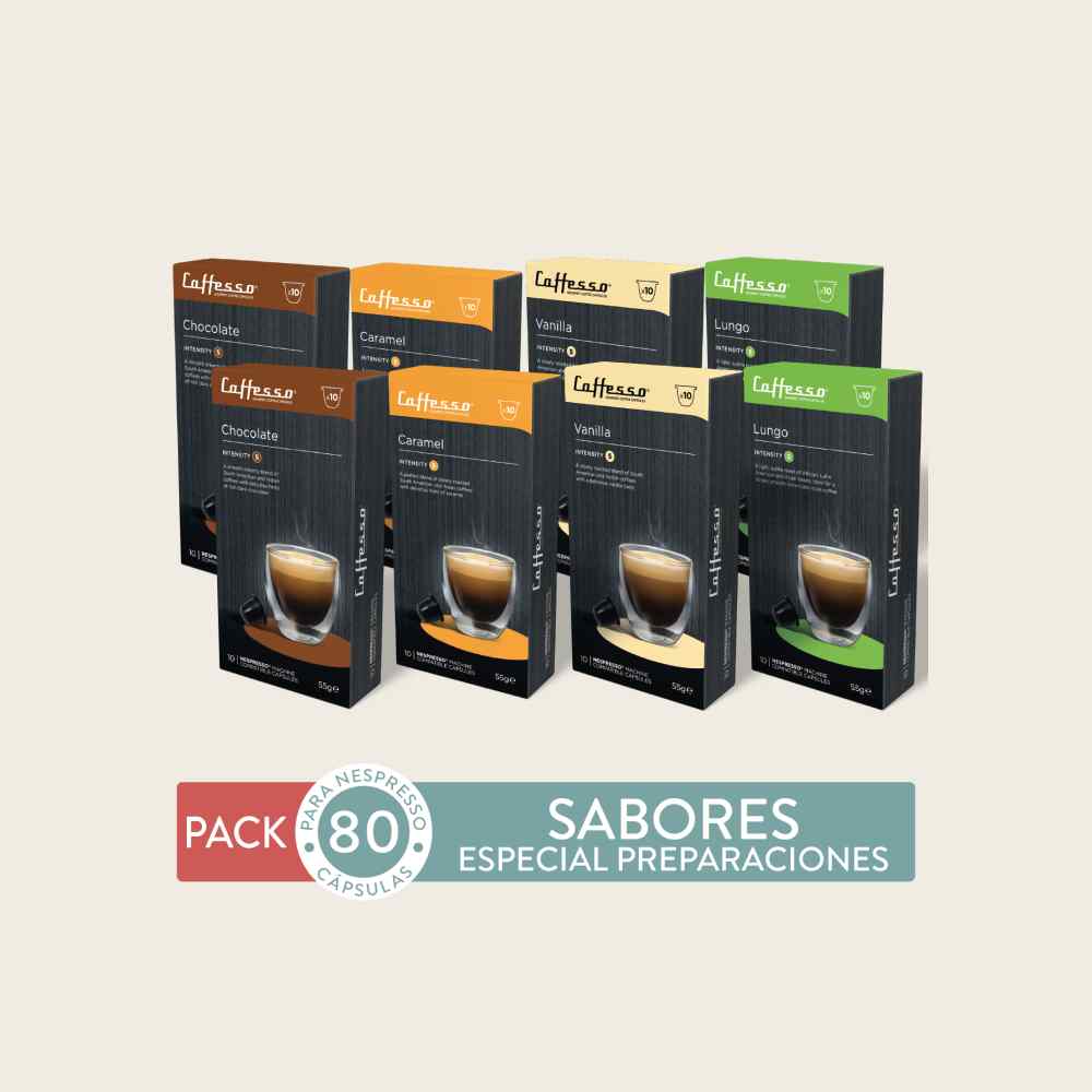 Con este pack disfruta haciendo preparaciones con leche tipo <em>Lungo </em>y agregando todo el sabor del Chocolate, Caramelo y Vainilla. Mézclalos como quieras y obtén un delicioso café con sabores. Potencia tu preparación con un shot extra de Lungo!<br