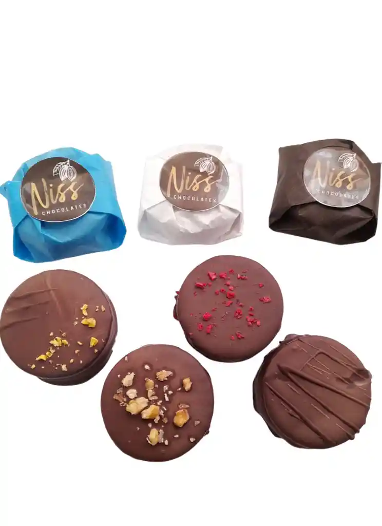 Increíbles alfajores rellenos de un suave manjar, bañados en chocolate negro 56% de cacao. Los sabores vienen surtidos entre Manjar Tradicional, Manjar frambuesa y Manjar Nuez. Deliciosamente adictivos.