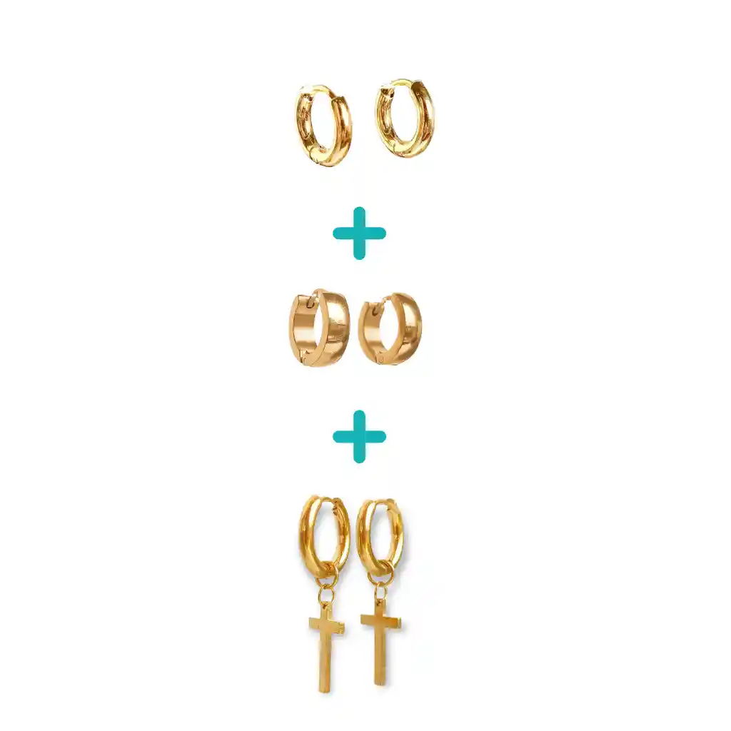 Bello pack o set de aros chapados en oro 18k. El pack consta de un par de argollas de 8mm de diámetro interno, mas un par de argollas tipo Huggies de 11 mm de diámetro interno aproximadamente con una cruz colgante que puedes retirar si lo deseas, más una argolla con un estilo un poco más grueso formando las tres juntas una combinación perfecta para tus piercings de orejas en tendencia. Este es parte de nuestra colección de aros con bellas combinaciones que ni imaginas. Visita el resto de nuestros productos donde indica otras publicaciones del vendedor y encontraras todo lo que tenemos para ofrecerte. Metal: Chapadas en oro 18k Diámetros disponibles: Argolla chica 8mm + Argolla Huggies de 11mm de diámetro interno aproximado con cruz colgante que se puede retirar + Argolla de 8mm, pero con un poco más de espesor. Colores; Dorado Peso aprox 4 g Se envía en bella presentación de regalo